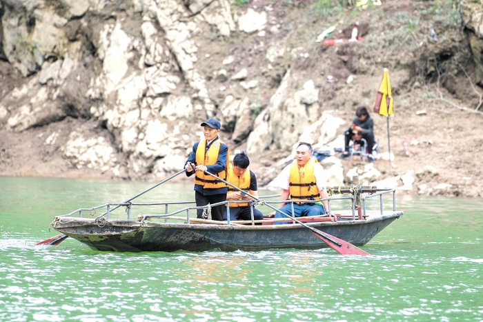5月29日,建始縣三里鄉大沙河村,萬其珍(左一)撐船擺渡過河。 (湖北日報全媒記者 蔡俊 攝)