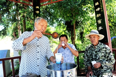涼亭中央的石桌上,大半缸川芎涼茶靜靜散發著香氣。村民們三五成群圍坐一起,邊喝涼茶邊消暑。一旁,滿頭銀發的徐桂梅則搖著蒲扇提醒大家慢點喝。