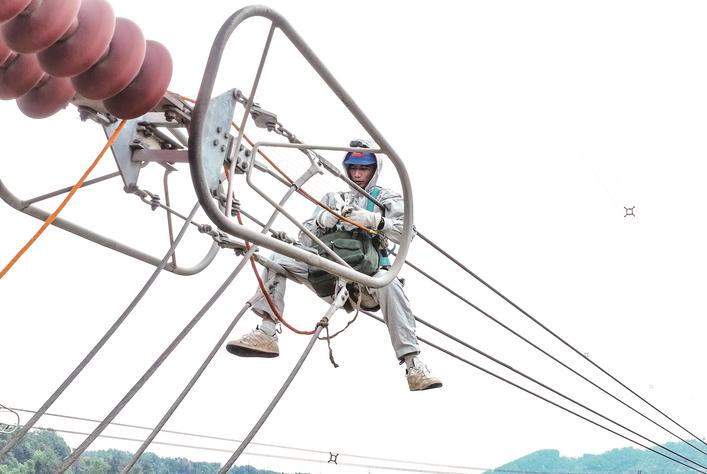 “申請進入等電位!”一步步爬到30多米高的鐵塔橫擔處,胡洪煒縱身踏上絕緣子,導線上立馬傳來密集的“嗞嗞”電流聲。