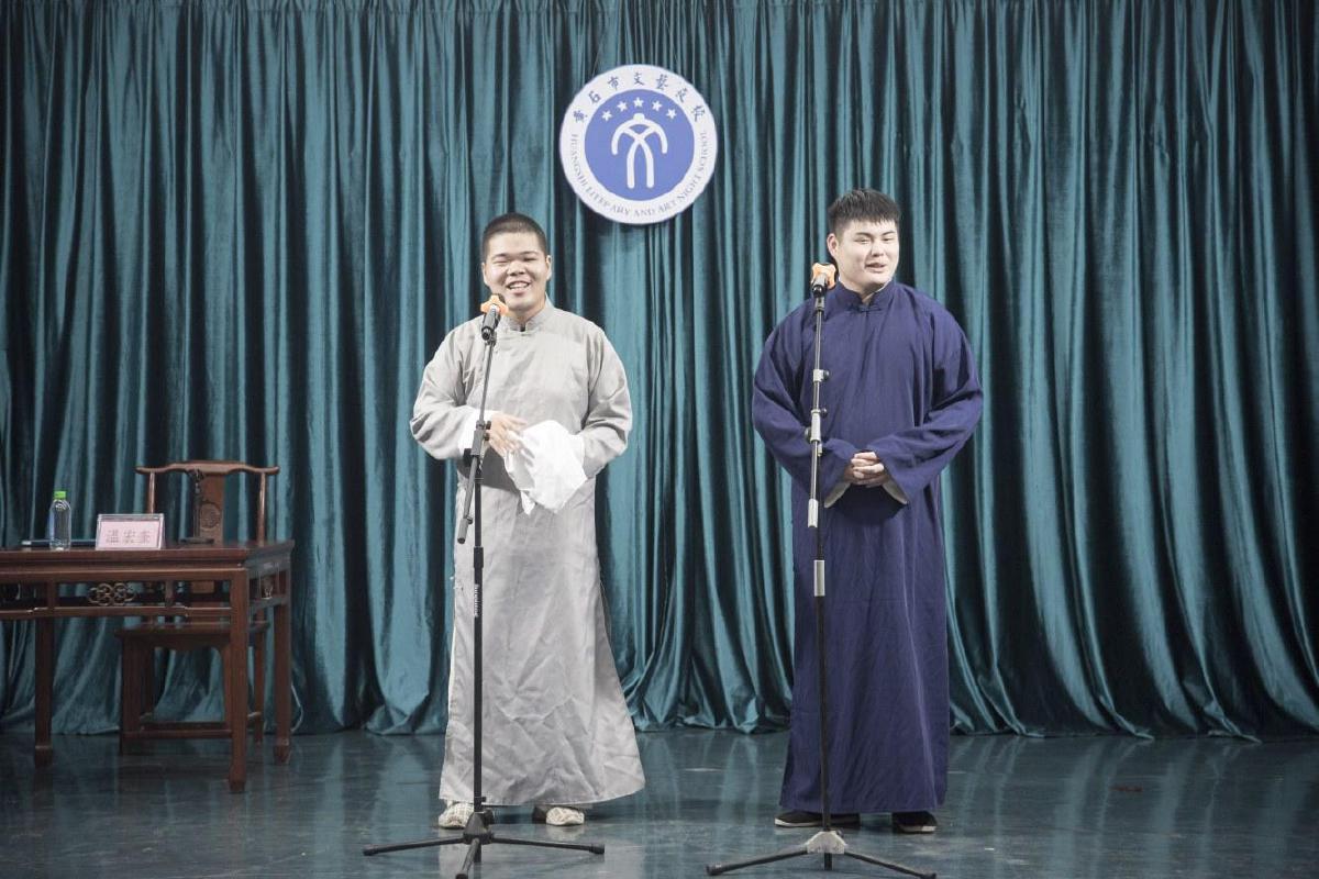 9月13日晚,市戲劇曲藝家協(xié)會副主席溫宏奎擔(dān)任主講嘉賓,帶來一堂傳統(tǒng)相聲體驗課。課堂上,他將中國傳統(tǒng)相聲發(fā)展史、近幾年相聲發(fā)展現(xiàn)狀與當(dāng)下娛樂現(xiàn)狀相結(jié)合,深入淺出地剖析傳統(tǒng)相聲的分類和作用。市青年相聲演員陳嘉誠、諶霆鋒為大家?guī)韨鹘y(tǒng)相聲《賣布頭》,幽默風(fēng)趣、寓教于樂的演出深受學(xué)員喜愛,現(xiàn)場掌聲不斷。