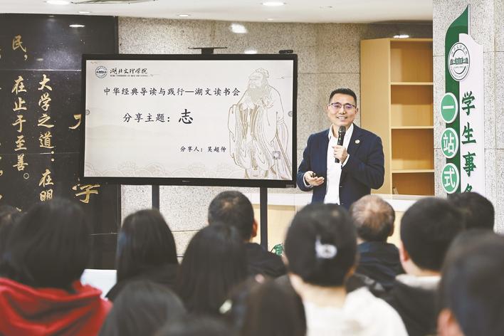 “國學經典學習——湖文讀書會”堅持“學經用典,修身養性”,引導廣大師生“愛讀書、讀好書、善讀書”,將教育教學與經典閱讀有機融合,豐富校園文化,厚植家國情懷,傳承愛國精神。每期讀書會由導讀講師圍繞主題進行學習分享,參會的師生自由交流,分為“感悟經典、踐行經典、研討經典、誦讀經典”四個環節。讀書會強調學以致用,通過師生“共學、共享、共長”,達到“引發思考、引起共鳴、引導踐行”的效果。“國學經典學習——湖文讀書會”為師生搭建了一座通往國學經典的智慧橋梁,已成為學校黨建引領、文化育人的實踐典范,為校園注入了濃厚的文化氣息,讓國學經典在新時代煥發出勃勃生機。