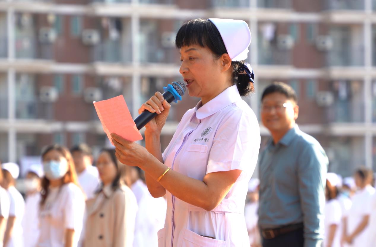 升旗儀式后,在趙光紅副校長的帶領(lǐng)下,參加儀式的全體師生舉起右臂,面對鮮艷的五星紅旗莊嚴(yán)宣誓,鄭重承諾:“當(dāng)我步入神圣護(hù)理行列的時刻,謹(jǐn)莊嚴(yán)宣誓:我志愿獻(xiàn)身護(hù)理事業(yè),奉行人道主義精神,堅守救死扶傷的信念,履行‘保存生命、減輕痛苦、促進(jìn)健康’的職責(zé);我宣誓:遵守護(hù)士的職業(yè)道德規(guī)范,像南丁格爾那樣,以一顆同情的心和一雙愿意工作的手,以真心、愛心和責(zé)任心對待每一位病人;我宣誓:不忘今天的決心和誓言,熱愛專業(yè)、勤勉好學(xué),忠于職守,兢兢業(yè)業(yè),接過前輩手中的紅燭,燃燒自己,照亮他人,將畢生精力奉獻(xiàn)給護(hù)理事業(yè)。”誓言鏗鏘有力,一字一句都代表著他們對護(hù)理事業(yè)的無限熱愛與執(zhí)著追求,決心踐行南丁格爾精神。