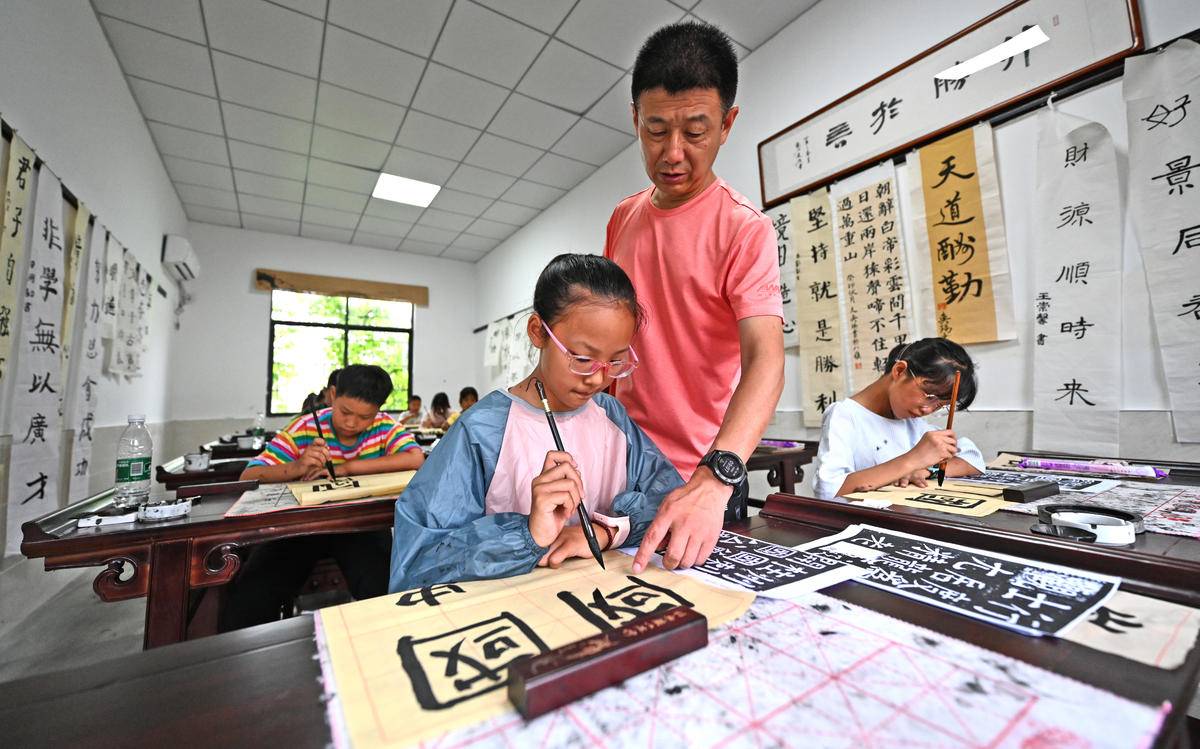 2024年7月10日,荊州市荊州區八嶺山鎮新灣村新時代文明實踐站熱鬧非凡,村里的孩子走進鄉村“書法大講堂”,開始別樣的暑假生活。(湖北日報全媒記者 劉曙松 攝)