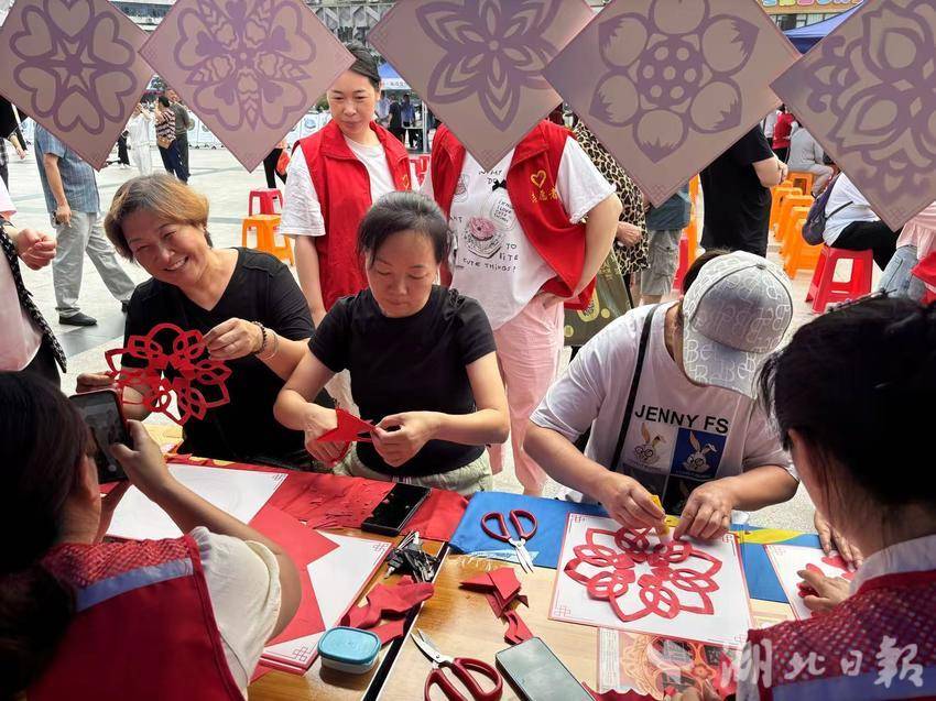 “注意剪刀力度的把握,沿著折疊的線條下刀……”剪紙、皮影體驗區,王女士在志愿者指導下,手起刀落,短短幾分鐘,剪出了團花樣式。“很有趣,看到自己包的粽子很有成就感。”互動體驗包粽子攤位上,捋葉、填米、封口、扎捆,清香的粽葉和晶瑩的糯米,通過一雙雙巧手,變成有棱有角的粽子。