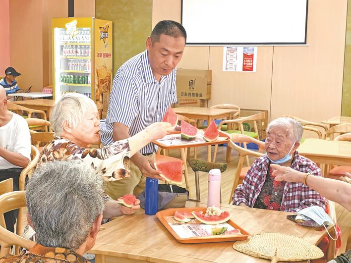 “西瓜真甜,甜到我們的心里去了?!痹谛腋J程?,社區(qū)工作人員端上一盤(pán)切好的西瓜,一塊塊地送到老人手中。老人們吃著手中的西瓜,滿臉笑容?!斑@兒比在家里愜意,也有意思!”居民胡桂梅老人跟自己的幾位好姐妹圍坐在一起,吃著西瓜扯家常。她是和朋友錢敏玲老人一道來(lái)納涼的,“涼快、舒服、吃飯方便,還能跟朋友待在一起,我以后要天天到這兒來(lái)!”窗明幾凈的食堂里充滿了老人們的歡聲笑語(yǔ)。