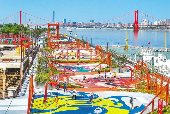 在漢陽,昔日內河第一大貨運港楊泗港化身都市T臺。龍門吊、航車軌道,國風籃球場、彩色集裝箱,吸引絡繹不絕的年輕人前來打卡、運動。