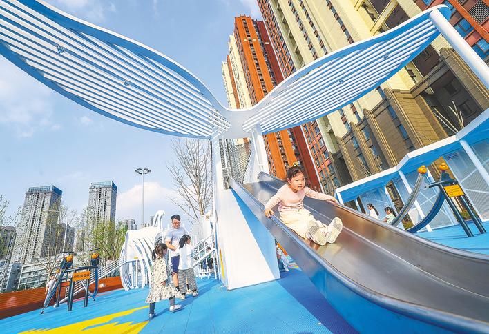 武漢遠洋鯨奇兒童友好公園,孩子們在愉快地玩耍。(湖北日報全媒記者 薛婷 攝)