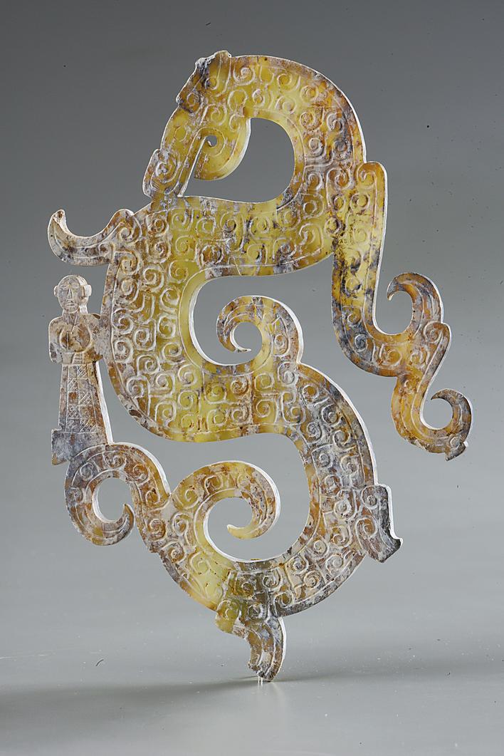 湖南長沙象鼻嘴墓出土的西漢透雕動物紋玉劍首,正中鑲嵌一綠松石片,周圍透雕出龍、鳳、熊等動物造型環繞,淺浮雕出眼、鼻、耳、喙、爪等細節。構思巧妙、雕工精湛、紋飾繁復,是漢代長沙國的玉雕精品。